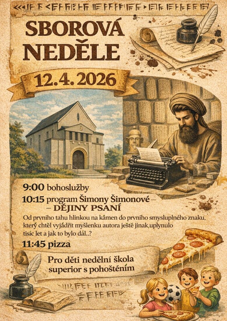 Bohoslužby od 9 hodin, pak od 10:15 program s projekcí "O dějinách psaní (1. díl)" autorky Šimony Šimonové. Děti jsou po celý čas zváni do prodloužené nedělní školy spojené s pohoštěním. Přibližně v 11:45 by mohla dorazit vámi osobně vybraná pizza... Jste zváni.