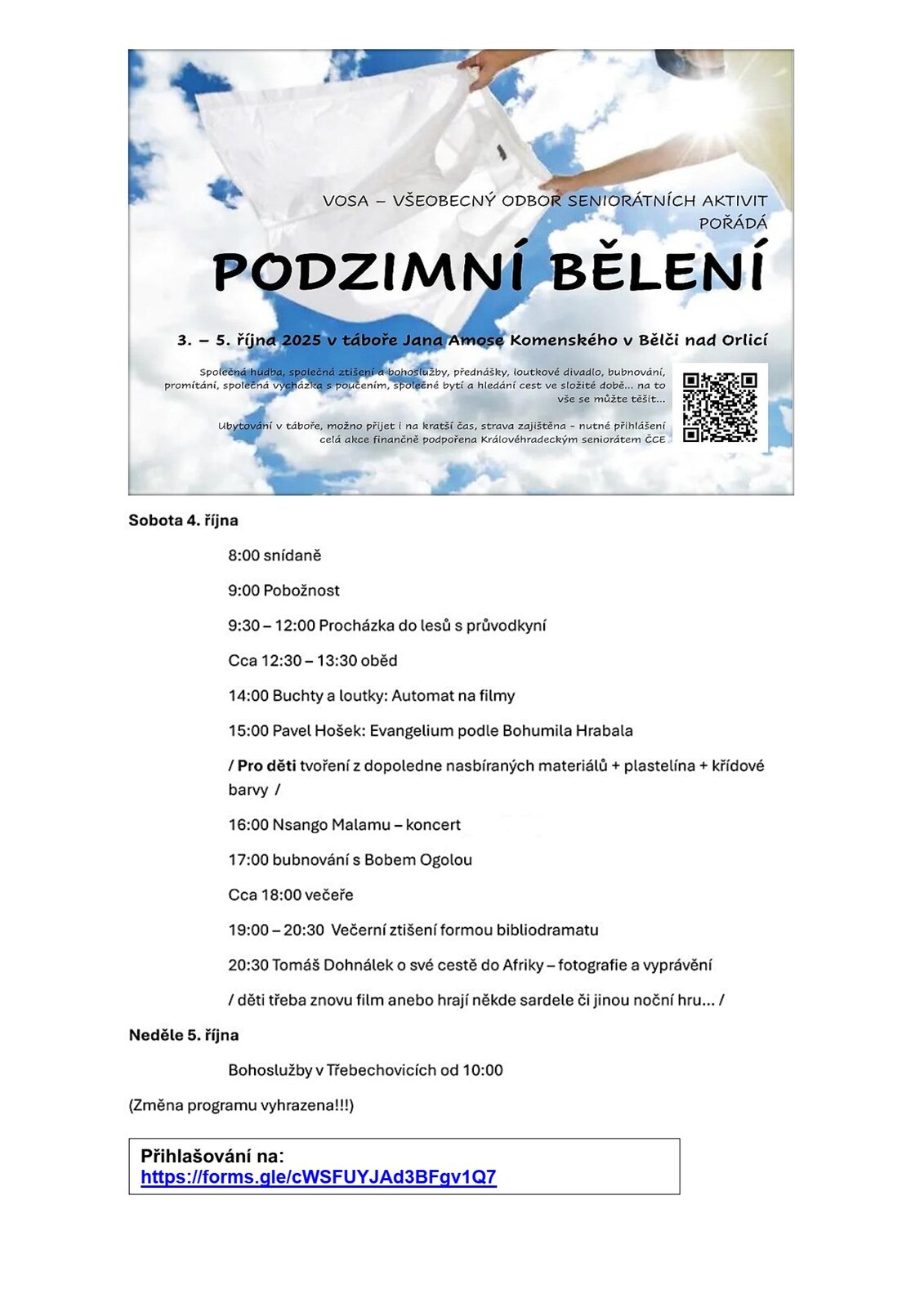 Podzimní bělení se jmenuje setkání v rámci sborů královéhradeckého seniorátu v Bělči - hlavní program je v sobotu 4. října odpoledne, podrobně na letáčku. Pro jídlo je třeba se předem přihlásit, odkaz dole na letáčku. Čeká nás divadlo Buchty a loutky, koncert Nsango Malamu a přednáška prof. P. Hoška o Bohumilu Hrabalovi.